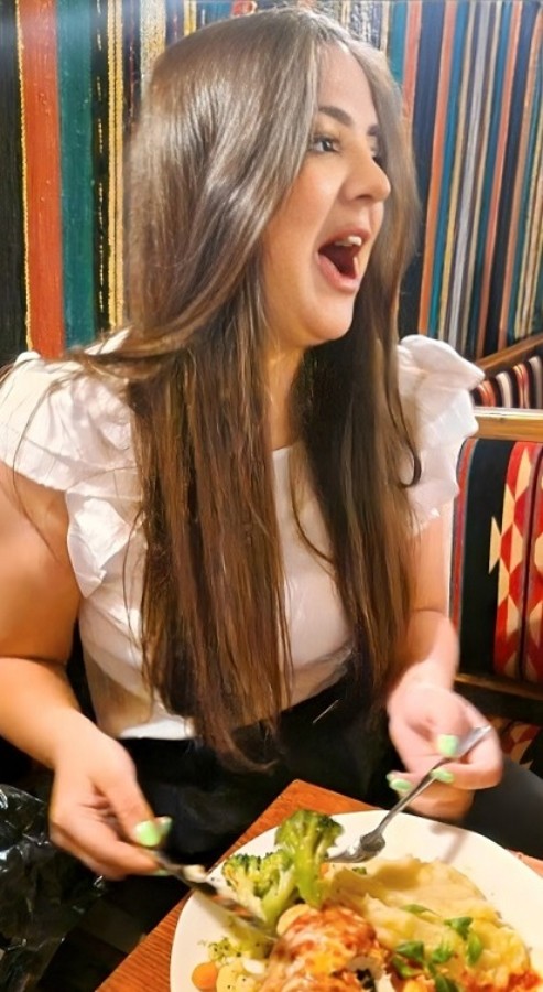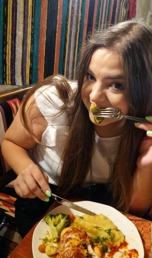 As she enjoys her meal, the focus is on the little moments of joy—taking a bite of delicious food, savoring the flavors, and engaging in lighthearted conversations with friends. Her body language is relaxed and content, capturing the essence of a peaceful evening spent in good company. The black pants add an edge of sophistication, while the white top radiates freshness, making her look effortlessly chic, even in the casual setting of the cafana.