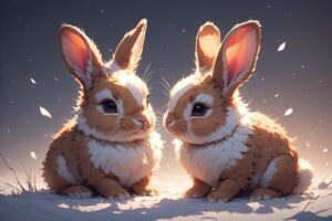 Two tiny lionhead rabbits sitting side by side, looking like they just walked out of a shampoo commercial.
